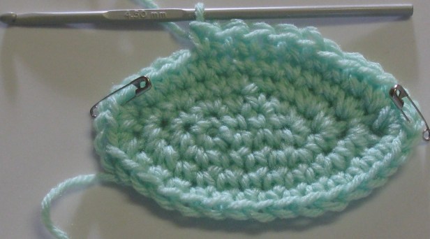 Tour 2 : 1 ms dans chaque maille jusqu’à ce qu’il reste une maille avant d’arriver au marqueur, 2 ms dans cette maille, enlever le marqueur et faire 3 ms dans la maille où se trouvait le marqueur, 2 ms dans la maille suivante, replacer le marqueur dans la maille située au centre des 3 ms. Faire de même pour l’autre côté de l’ovale. Ne pas joindre.